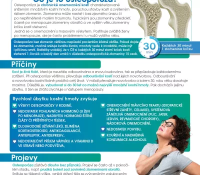 Osteoporóza je chronické onemocnění, při kterém dochází k úbytku kostní hmoty a oslabení struktury kostí. Kosti se stávají křehčími a náchylnějšími ke zlomeninám, a to i při běžném pádu nebo menším úrazu. Nejčastěji postihuje páteř, kyčle a zápěstí a dlouhodobě může vést k bolestem, snížení pohyblivosti a zhoršení kvality života. Více informací si můžete přečíst v přiloženém letáku.